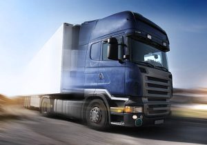 Transport truck speeding on freeway, blurred motion.